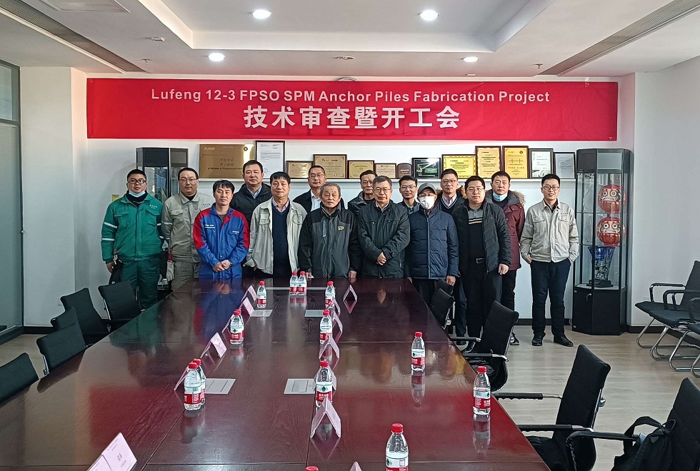 陆丰12-3 油田开发配套一艘10万吨级双壳型FPSO,配有内转塔式单点系泊系统,共设计9根锚桩,单桩重约115吨。2021年12月28日,项目技术审查暨开工会举行。海油发展专家曹慧军、采油公司总工程师兼陆丰12-3油田FPSO工程建设项目组总经理姚志义、安全生产部经理曾祥虹等莅临现场,Bluewater现场代表兼项目建造经理孙郑、ABS代表张淳及罗利军、蓬莱巨涛总经理刘玉年、常务副总经理刘东涛及项目组成员出席了会议。